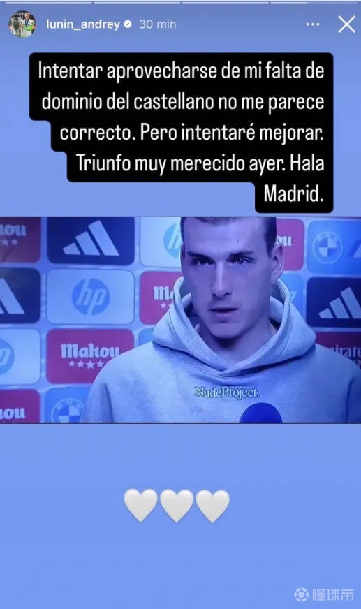 在今天凌晨进行的西甲第29轮比赛中,皇马3-2击败莱加内斯,赛后,卢宁在接受采访时对于裁判的言论引起了一些争议,随后,他在社交媒体上发表动态,进行了回应。