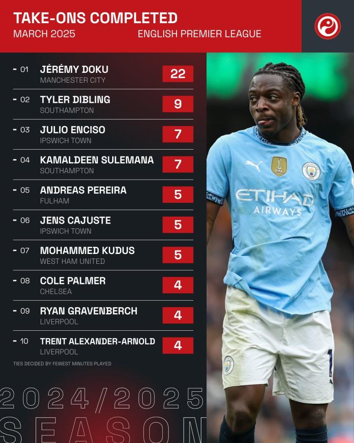 据统计,曼城边锋多库是在3月的英超联赛当中成功过人次数最多的球员。