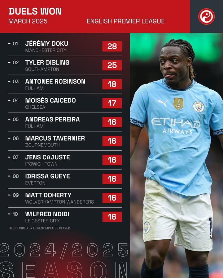 据统计,曼城边锋多库是在3月的英超联赛当中赢得对抗次数最多的球员。