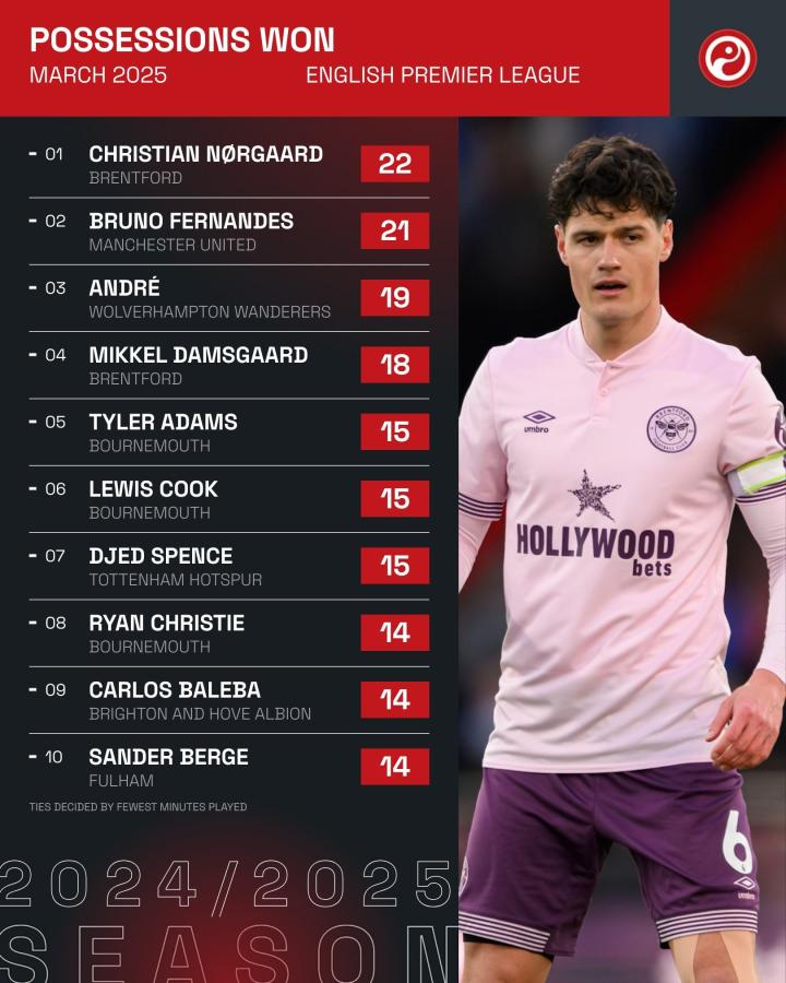 据统计,布伦特福德队长内尔高是在3月的英超联赛当中赢得球权次数最多的球员。