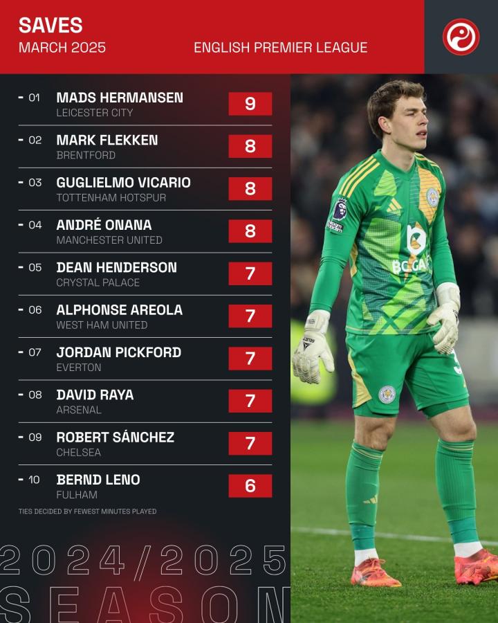 据统计,莱斯特城门将赫尔曼森是在3月的英超联赛当中完成扑救次数最多的门将。