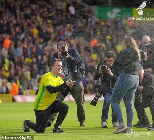 北京时间3月29日,在英冠第39轮诺维奇对阵西布朗的比赛中,一名诺维奇球迷在中场休息期间向女友求婚成功。