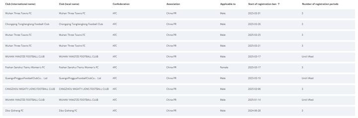 国际足联官方更新了转会注册禁令列表,在中国俱乐部当中,武汉三镇受到了最大的影响。