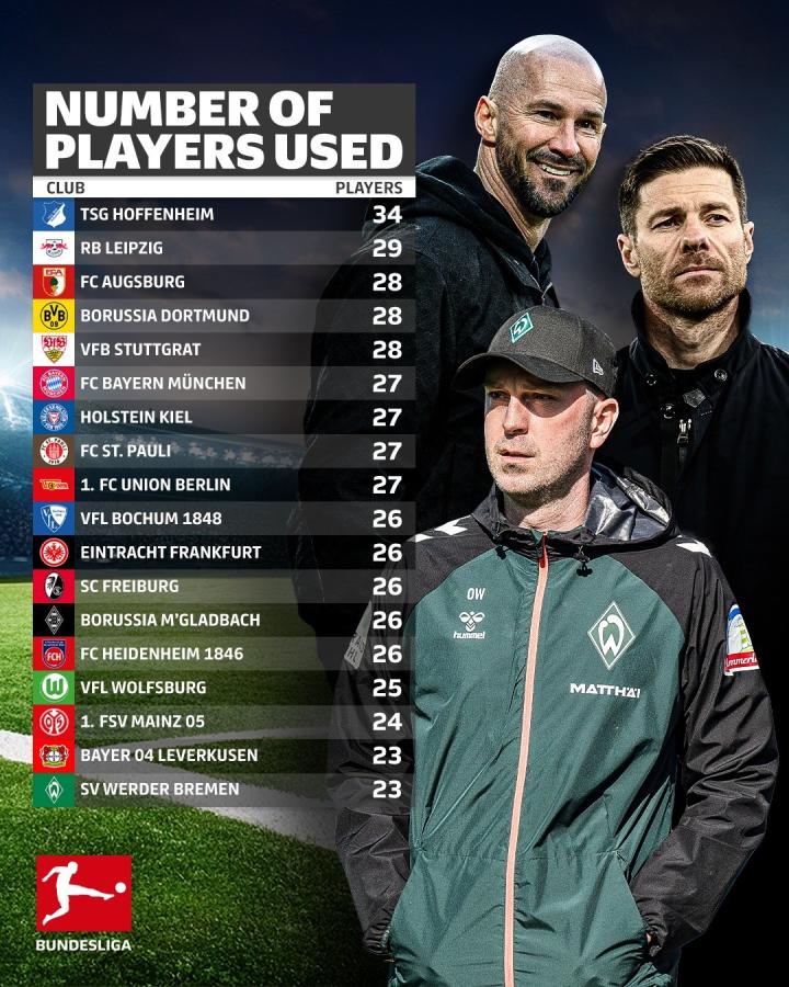 德甲27轮战罢,德甲官方列出了本赛季德甲使用球员人数排行榜,霍芬海姆34人最多,勒沃库森、云达不莱梅23人最少。