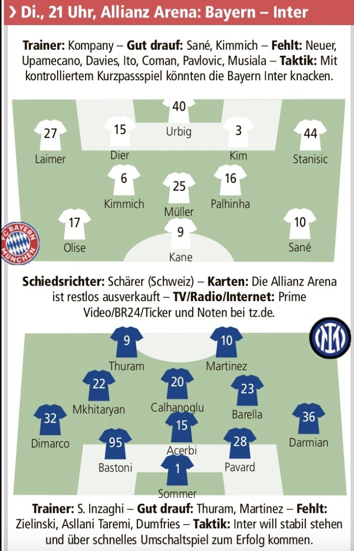 欧冠1/4决赛首回合,拜仁将在主场迎战国米。赛前,《慕尼黑日报》预测了两队的首发阵容。