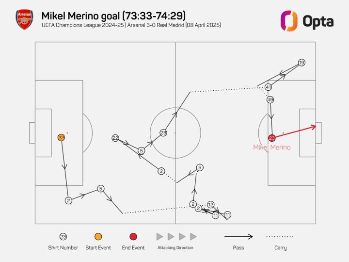 据Opta统计,阿森纳对阵皇马打入的第三球由门将发起经过连续16次传球后打进,为本赛季欧冠第二长。