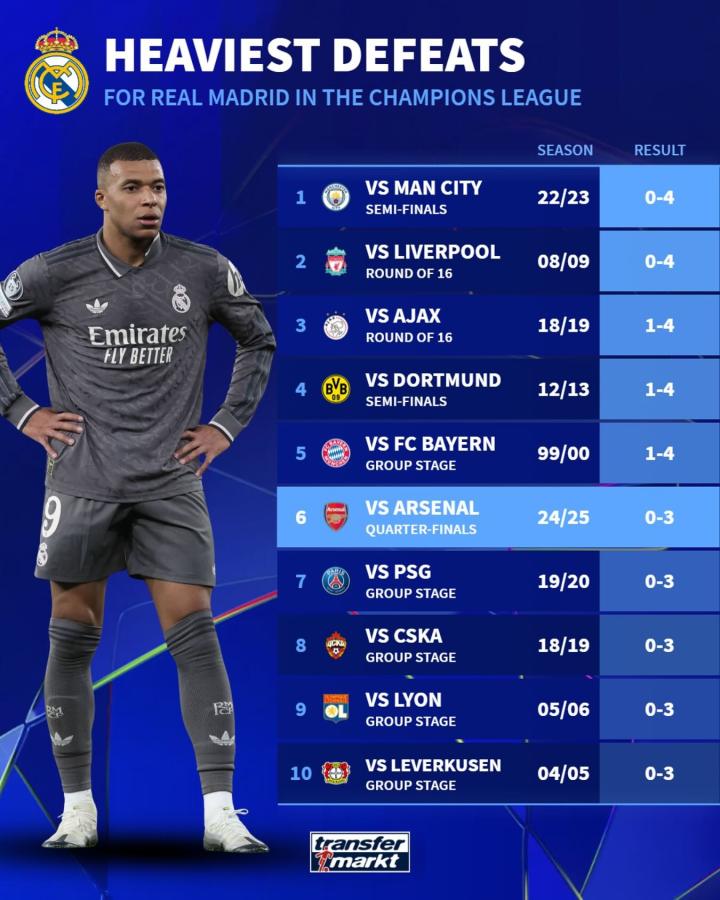 欧冠1/4决赛首回合,皇家马德里客场0-3不敌阿森纳,德国转会市场网站列出了皇马欧冠改制后最大分差失利,0-3阿森纳仅次于他们0-4不敌曼城和利物浦。