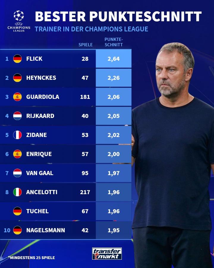 欧冠1/4决赛首回合,弗里克将带领巴萨对阵多特,德国转会市场网站列出了欧冠联赛执教至少25场比赛的主帅场均积分排行榜,执教了28场的弗里克以2.64分居首。