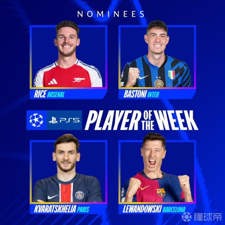 北京时间4月10日,本周欧冠1/4决赛首回合的四场比赛已经结束,欧冠官方公布了本周最佳球员的候选名单,莱万、赖斯、巴斯托尼和克瓦拉茨赫利亚在列。