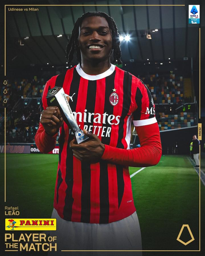 官方消息,莱奥当选乌迪内斯对阵米兰一役全场最佳。
