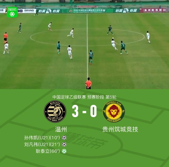 温州3-0贵州筑城竞技,孙伟凯、刘凡祎破门,耿泰立点射