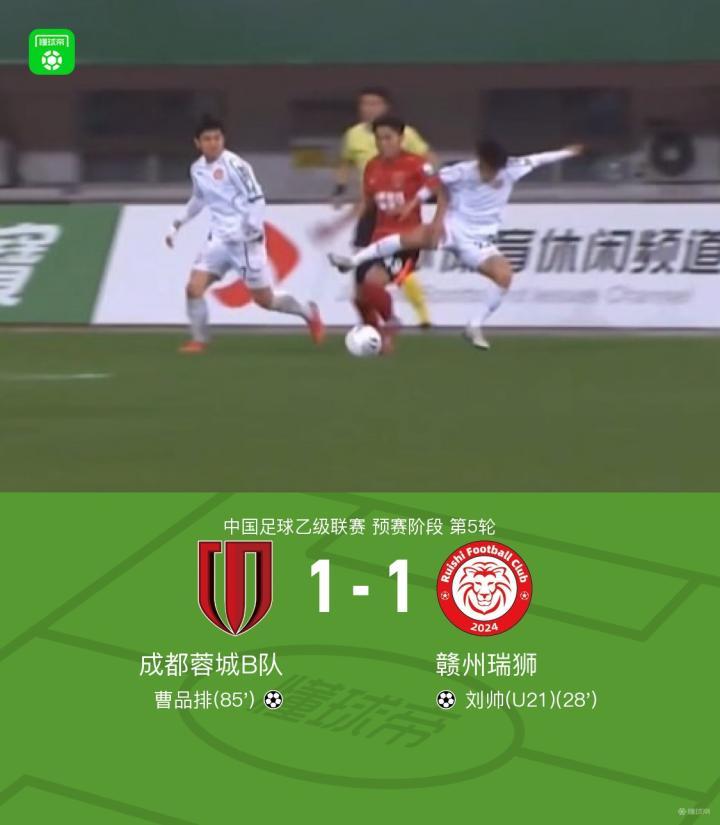 成都蓉城B队1-1赣州瑞狮,刘帅破僵,曹品排扳平比分