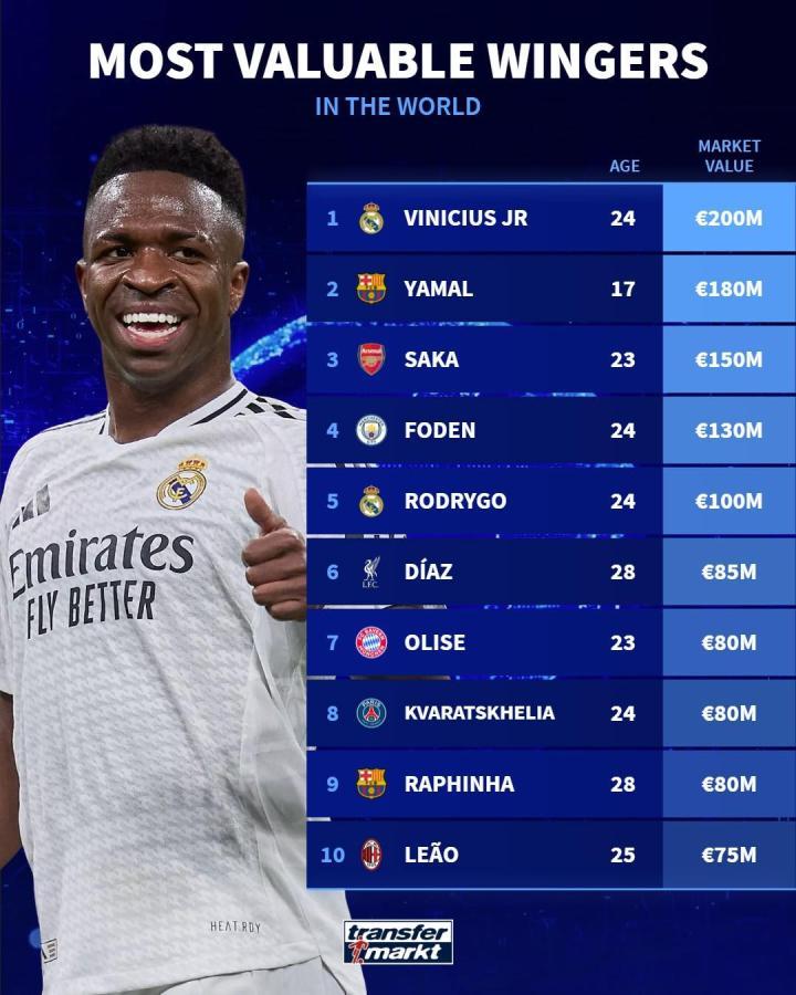 在完成最近一次身价更新后,德国转会市场网站列出了世界足坛边锋身价排行,维尼修斯2亿欧居首,亚马尔1.8亿欧列第二。