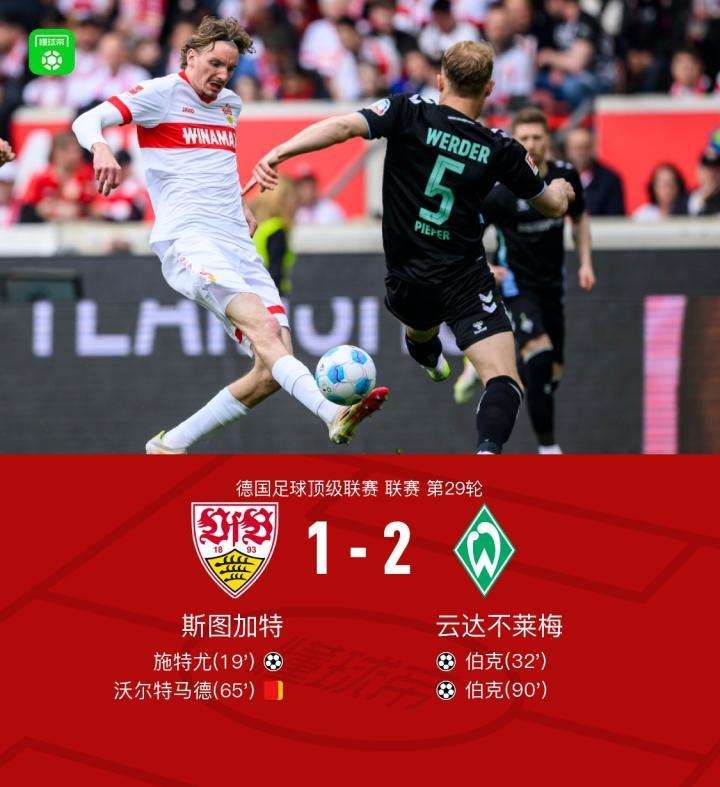 十人斯图加特1-2不莱梅,伯克双响+绝杀,沃尔特马德染红