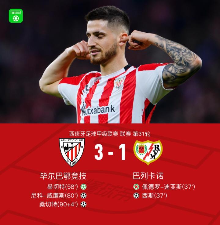 毕尔巴鄂竞技3-1逆转巴列卡诺,威廉斯破门,桑切特梅开二度