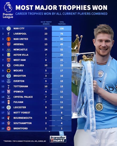 北京时间4月14日,德国转会市场列出了英超各队球员冠军总数,其中曼城居首,利物浦第二,曼联第三。