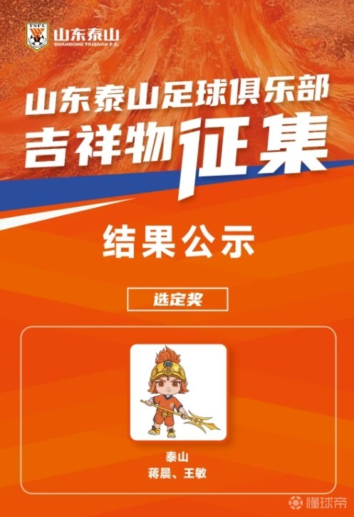 4月14日,山东泰山足球俱乐部官方消息,山东泰山足球俱乐部吉祥物征集结果公示:选定奖设计灵感来源于“泰山童子”雕塑,经多轮修改演变成五岳独尊泰山山神为蓝本的中国古代武将卡通形象。