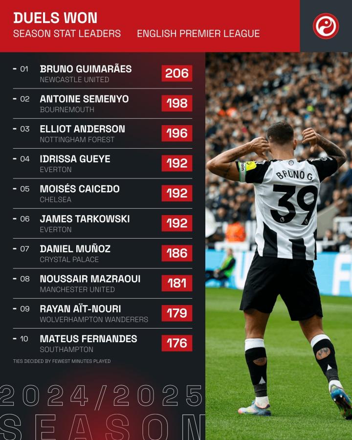 在英超第32轮结束后,纽卡斯尔联中场吉马良斯成为了赢得对抗次数最多的球员。