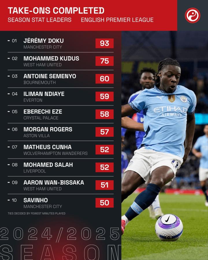 在英超第32轮结束后,曼城前锋多库成为了成功过人次数最多的球员。