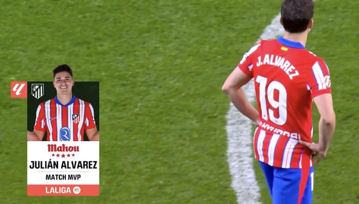 西甲第31轮,马德里竞技主场4-2击败巴拉多利德,此役上演点球梅开二度的阿尔瓦雷斯当选西甲官方全场最佳球员。