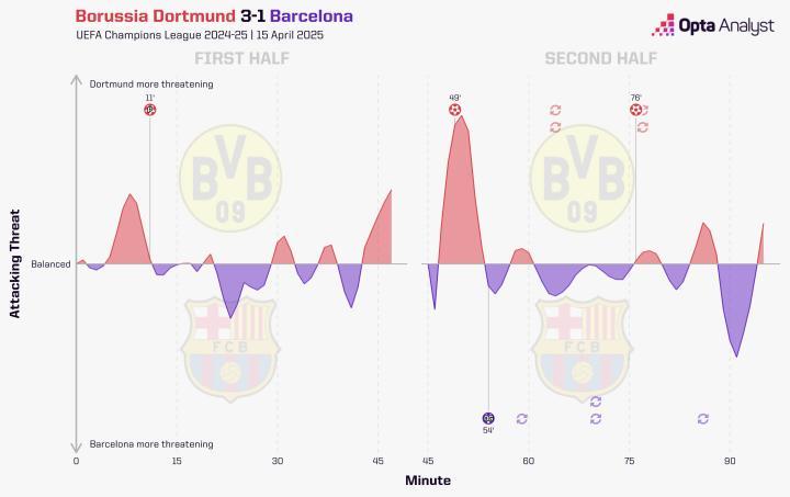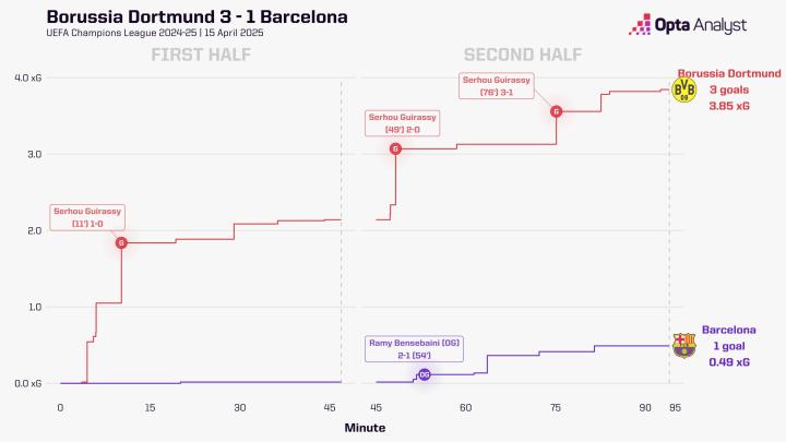 主场作战的多特本场预期进球达到了3.85,而巴萨的预期进球仅为0.49。多特18次射门中有11次射正,巴萨仅有2次射正,最终双方比分为3-1。
