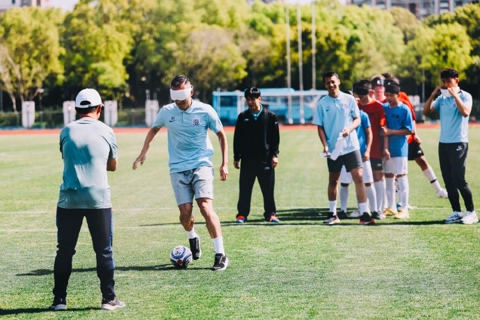 在歌手艾热的陪同下,球员们来到中心球场,与申花队球员吴曦、于汉超、朱辰杰、高天意、艾迪、周正凯展开了一堂特别的盲人足球训练课。在上海盲人足球队教练、上海盲童学校张健老师的指导下,大家进行了带球跑位、听声触球、攻防射门等一系列盲人足球技巧体验。