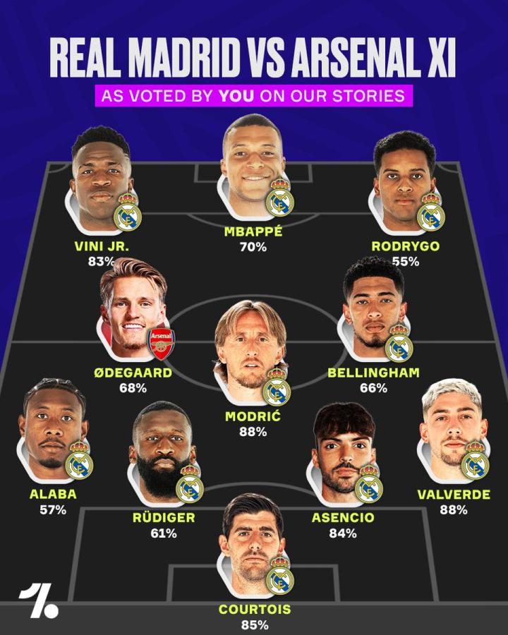 北京时间2025年4月16日,欧冠1/4决赛皇马vs阿森纳前夕,足球媒体OneFootball晒出球迷票选出的皇马阿森纳混合球队,枪手仅厄德高一人入选。