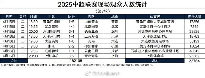 中超第7轮的比赛全部结束,现场观众人数方面,成都蓉城主场40615人居首,大连英博主场36133人排第2。本轮场均观众人数22764人