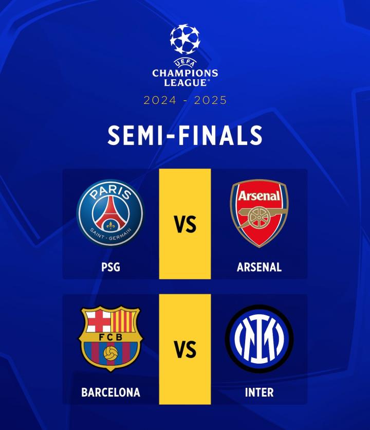 在本赛季的欧冠半决赛中,巴塞罗那遇到国际米兰,巴黎圣日耳曼与阿森纳交锋。