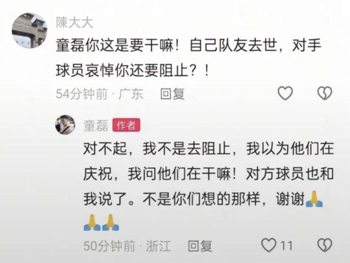 赛后有球迷在网上问童磊,为何要去阻止对方的哀悼?童磊回复:“对不起,我不是去阻止,我以为他们在庆祝,我问他们在干嘛!对方球员也和我说了。不是你们想的那样,谢谢。”