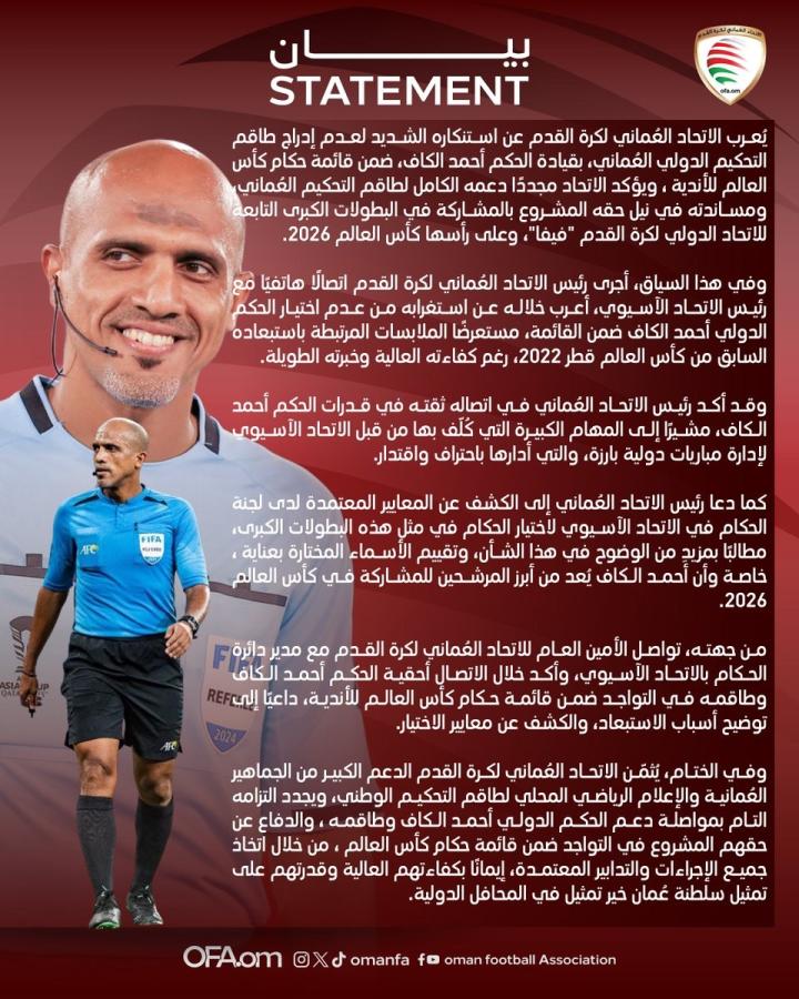 阿曼足协官方发布声明,表达对本国裁判艾哈迈德-卡夫落选2025年世俱杯裁判名单的不满,并呼吁公开裁判选拔标准,澄清落选的原因。