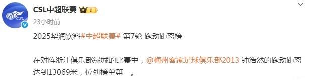 4月18日,中超联赛官方公布中超第7轮球员跑动距离榜,梅州客家球员钟浩然以13069米居首。随后,钟浩然在社交媒体里感慨道:“13.069公里,是赛场上的一串数字,更是团队托举的勋章🎖️”