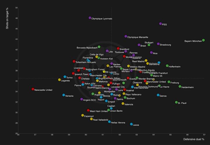 根据datamb.football数据统计,五大联赛球队本赛季防守对抗成功率 vs 射正率的分布图如下。