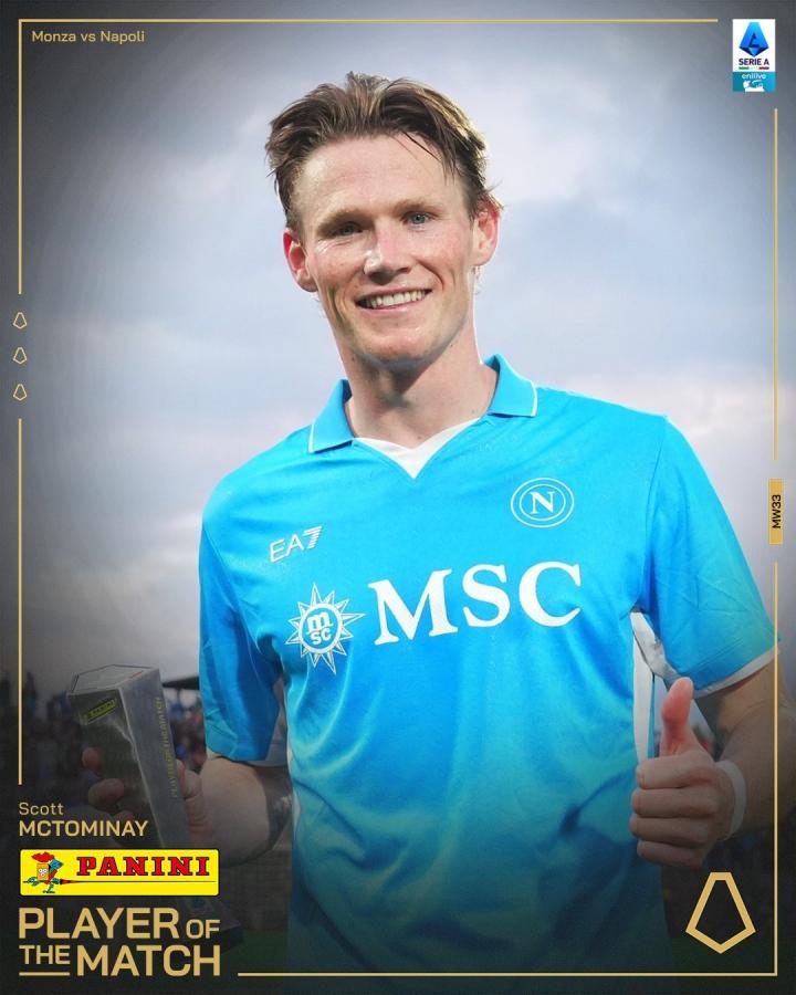 官方消息,麦克托米奈当选蒙扎对阵那不勒斯一役全场最佳。