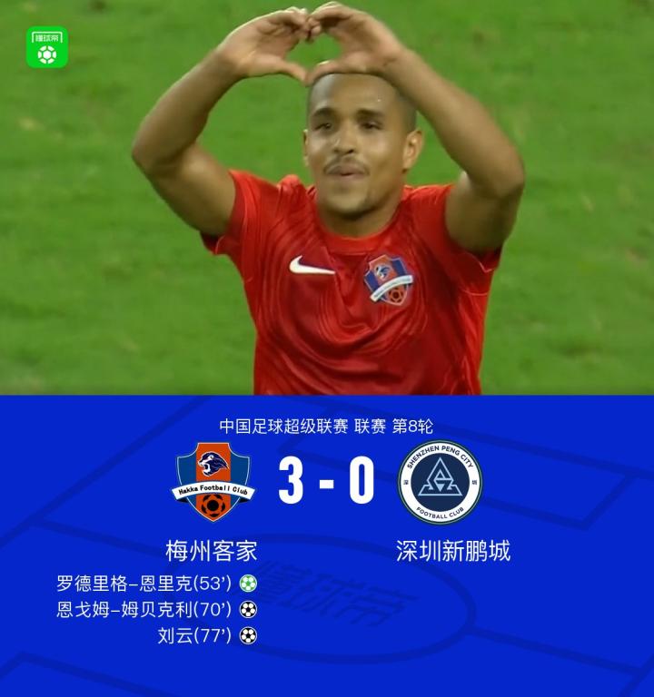 梅州3-0新鹏城,罗德里格传射,恩戈姆世界波,刘云替补建功