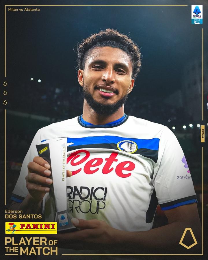 意甲第33轮,亚特兰大客场1-0击败米兰,打入全场唯一进球的亚特兰大中场埃德松-席尔瓦当选意甲官方全场最佳球员。