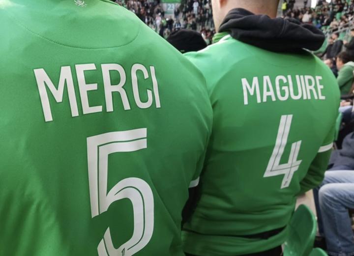 北京时间4月21日,法甲第30轮,圣埃蒂安2-1里昂。在本场比赛中,现场的两位圣埃蒂安球迷身穿印有“感谢马奎尔”的球衣,以感谢他绝杀死敌里昂。