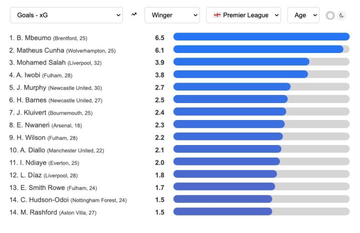 本赛季,有多位英超边锋及进攻型中场射门转化能力超过预期。据datamb网站统计,“Goals-xG”(进球数与预期进球之差)排名靠前的球员有: