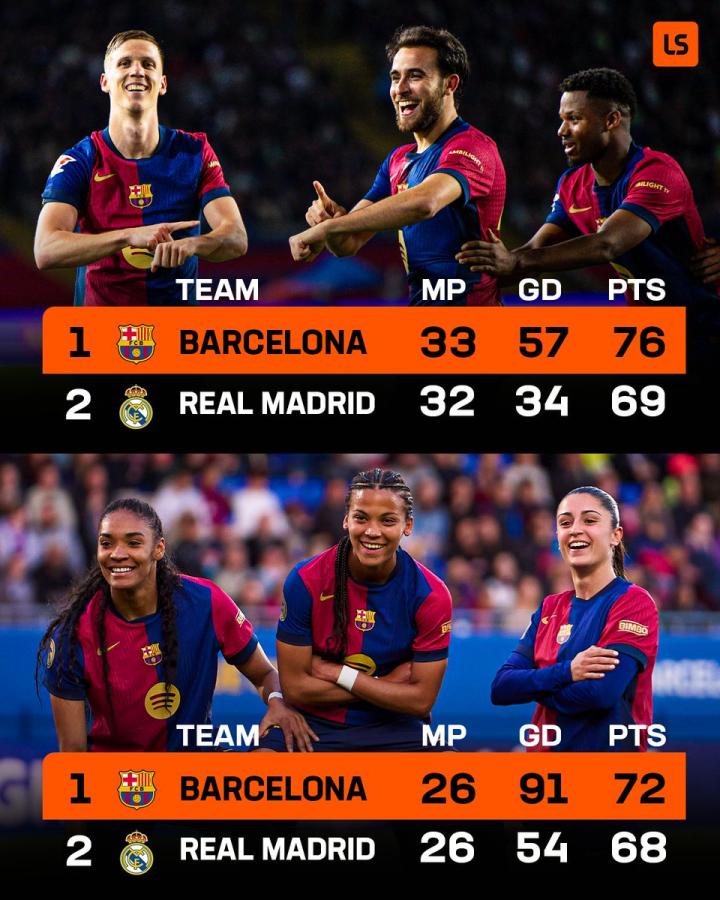 赛季末冲刺阶段,巴萨男女足皆领跑联赛积分榜,或许能在今年迎来男女足联赛双线冠军。