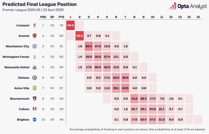 维拉仍然排名第七,距离前五名有两分的差距,但比他们的对手多打了一场比赛。他们的欧冠资格希望受到了打击,他们的概率现在下降到16.5%。