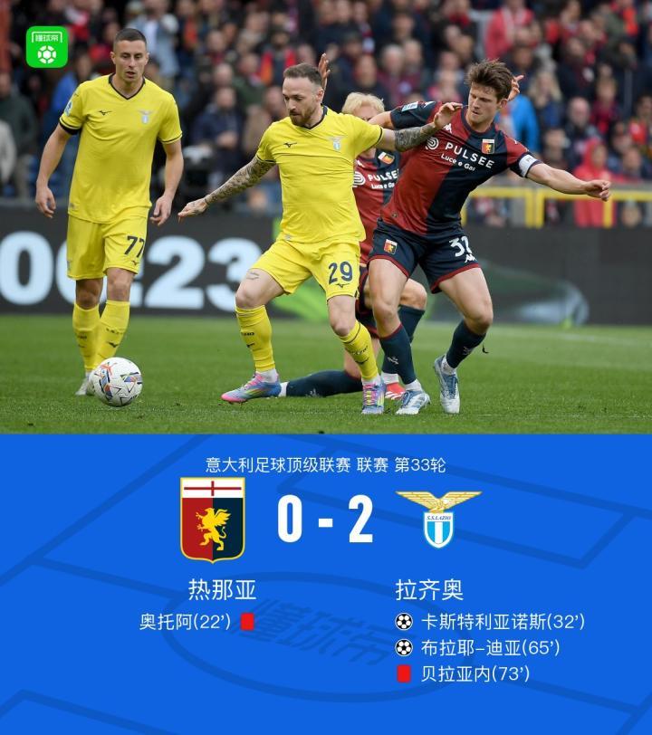 十人拉齐奥2-0十人热那亚,卡斯特利亚诺、布拉耶-迪亚破门