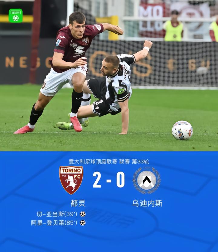 都灵2-0乌迪内斯,切-亚当斯建功,阿里-登贝莱锁定胜局