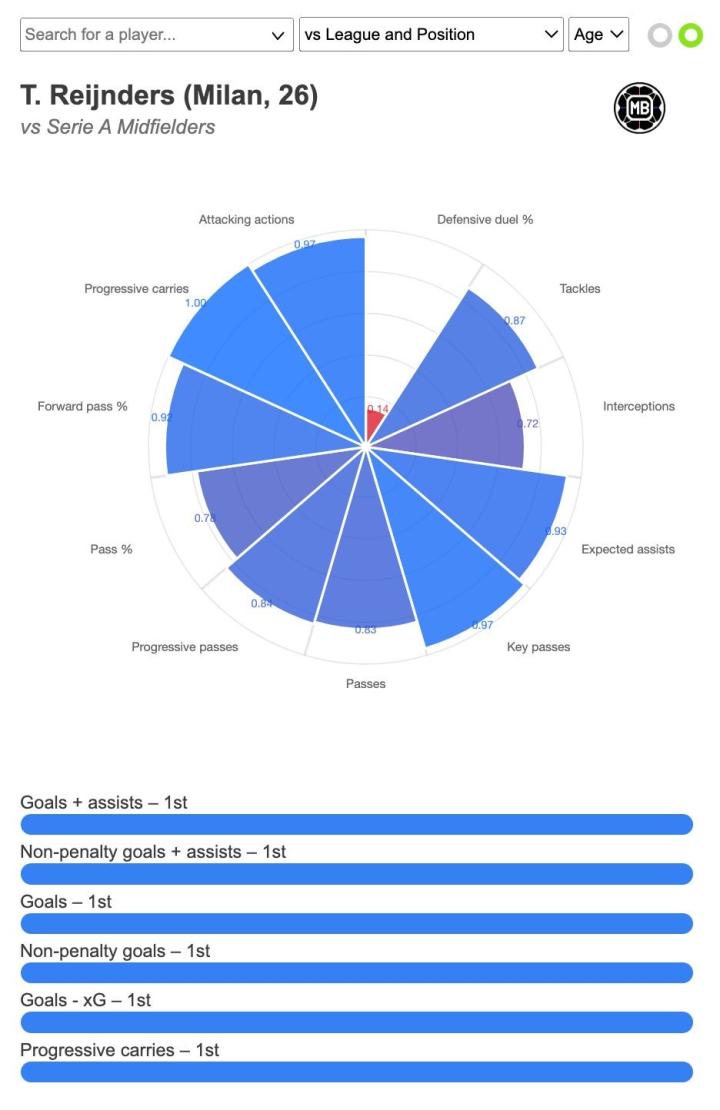 据datamb统计,本赛季赖因德斯在进球、进球+助攻、超预期进球、非点球进球、带球推进表现等方面领跑意甲中场。