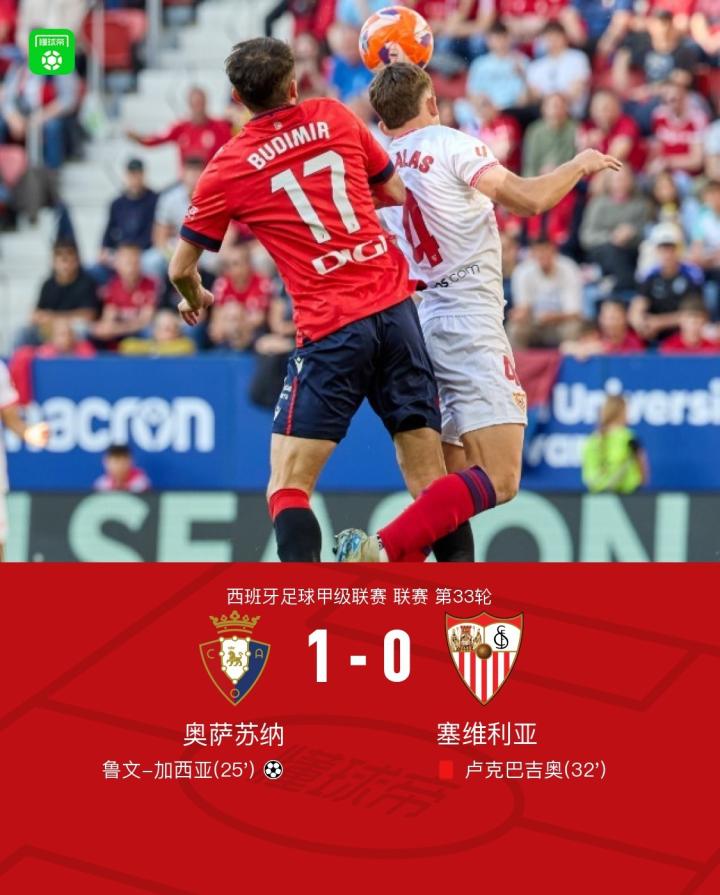 奥萨苏纳1-0十人塞维利亚,加西亚制胜,卢克巴吉奥直红