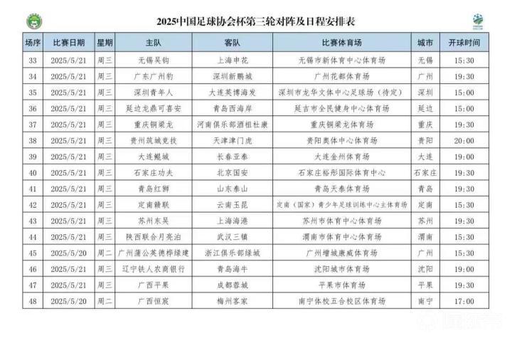 4月25日,足协杯官方发布了第三轮比赛的开球时间,其中14场比赛都将在5月21日进行,仅有2场球是在5月20日踢。