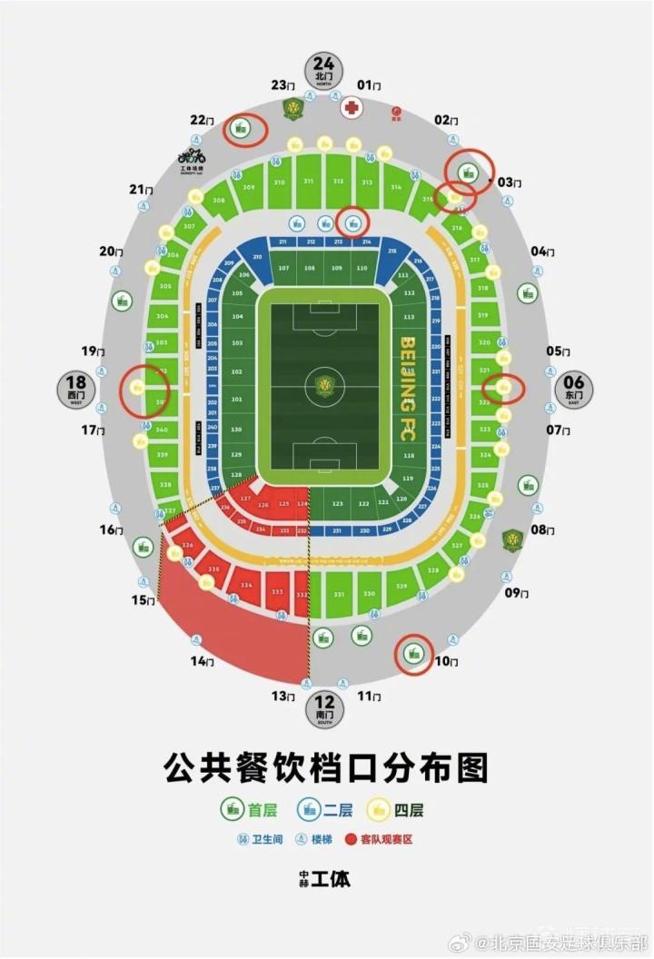 售卖啤酒的公共餐饮档口分别位于首层:03门、10门、22门附近;二层:213-214看台附近;四层:301-302看台附近、315-316看台附近、321-322看台附近;