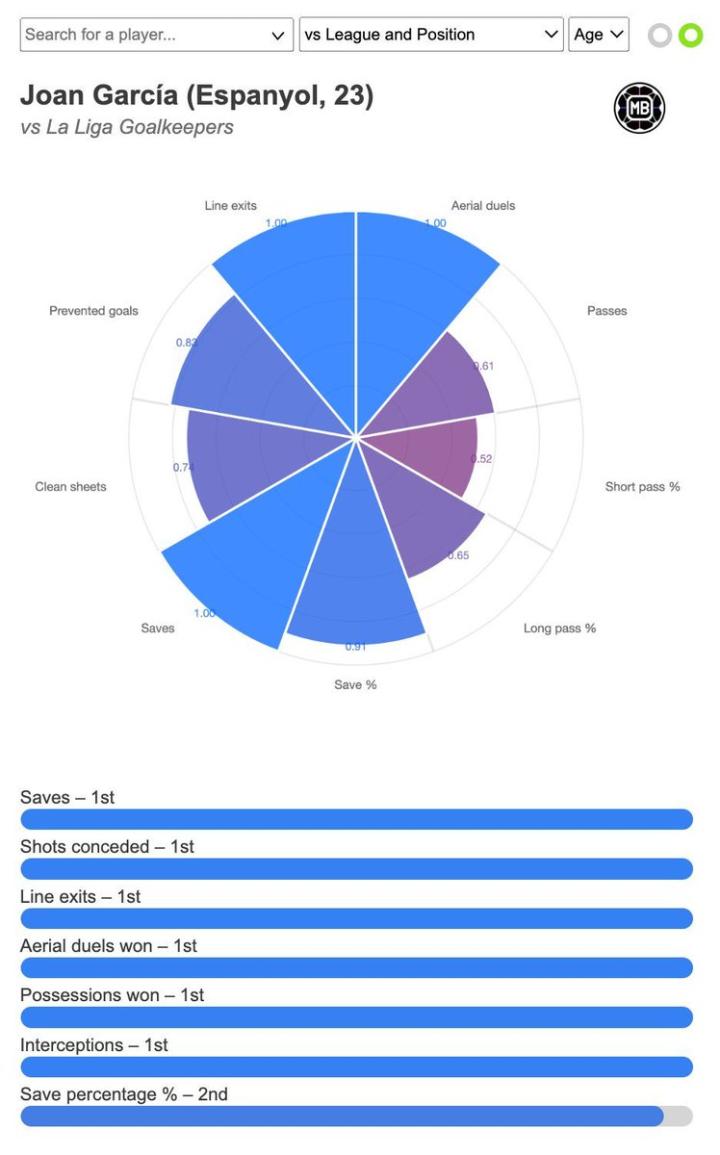 西班牙人门将霍安-加西亚近期收获了众多球队的关注。根据数据网站DataMB的统计,霍安-加西亚本赛季在西甲中有许多数据都名列前茅。