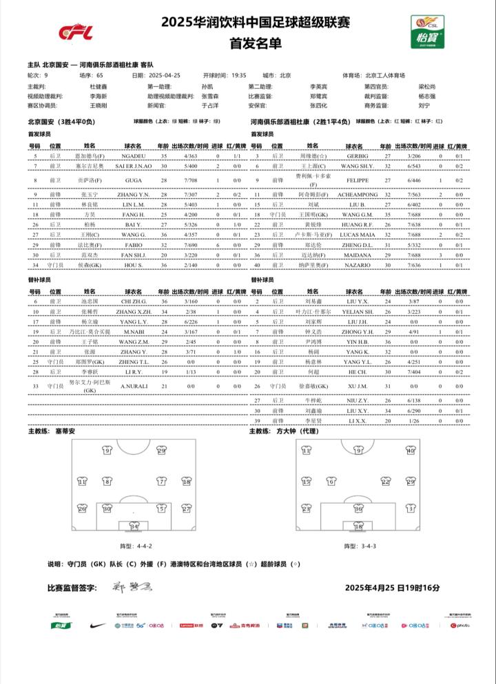 北京时间4月25日19:35,中超第9轮,北京国安主场对阵河南。
