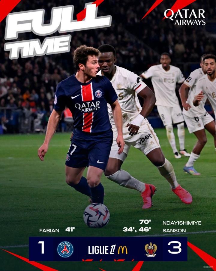 法甲第31轮,巴黎圣日耳曼1-3不敌尼斯,这是巴黎自2024年10月0-2不敌阿森纳以来首次净负2球。