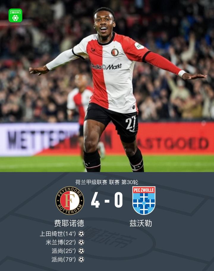 费耶诺德4-0兹沃勒,米兰博两传一射,派尚梅开二度